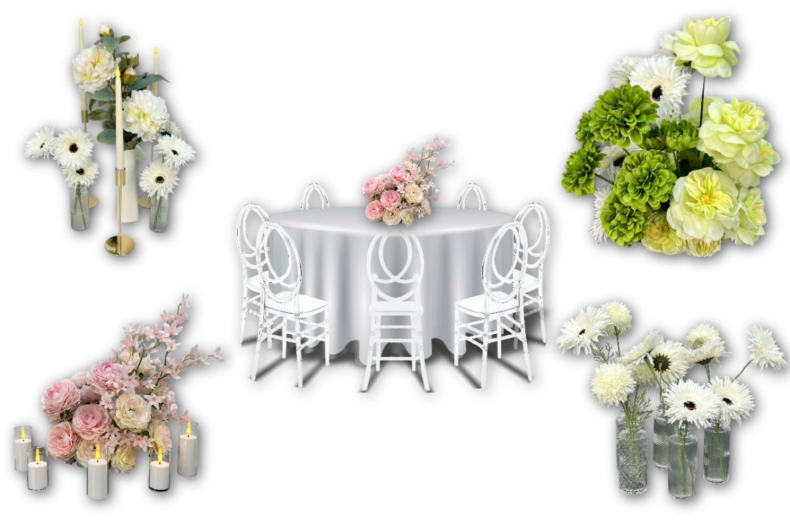 Состав и цвет флористики подберем под общую стилистику свадьбы. Сборка пробных композиций из декоративных цветов — в подарок!
